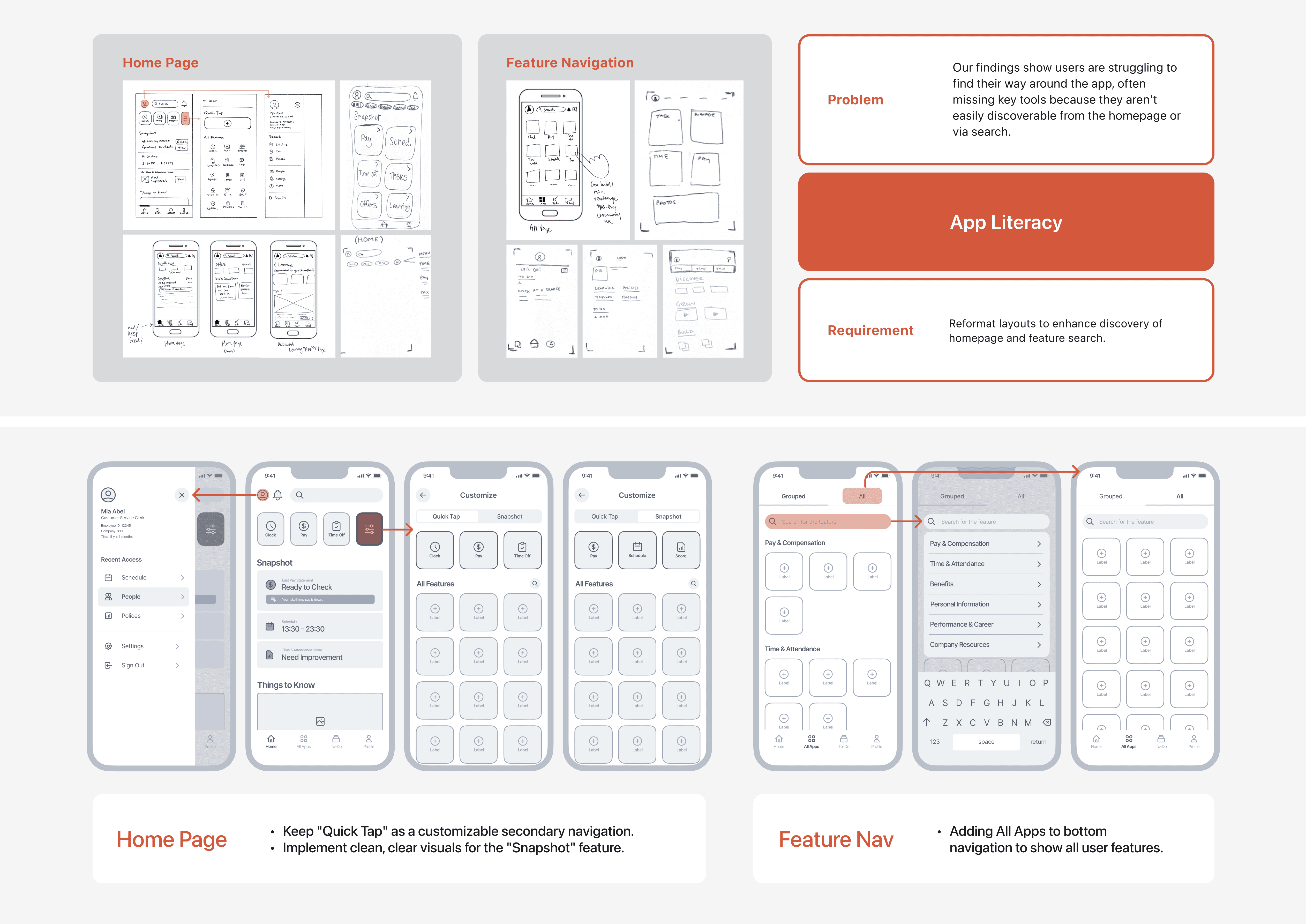 Utilizing site teardowns, comparative analysis, quantitative surveys, and semi-structured interviews, we uncovered significant friction points and narrowed our scope to Hourly Employees.